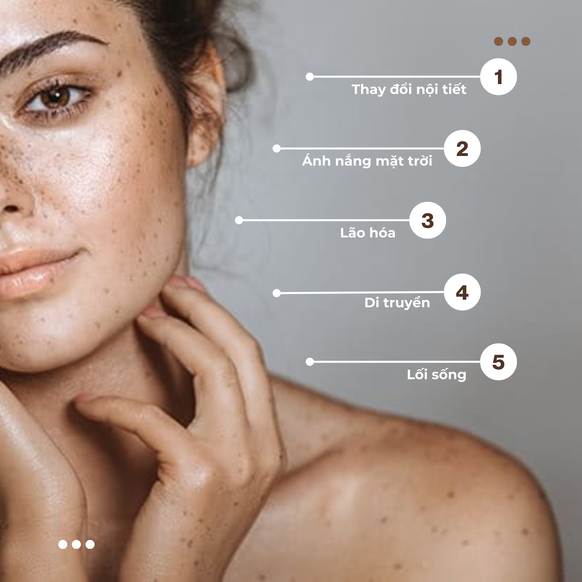 Lão hóa: Quá trình lão hóa của cơ thể khiến tốc độ sản sinh collagen tự nhiên giảm, da mất đi độ đàn hồi và dễ bị tổn thương bởi các tác nhân từ môi trường. Cơ thể cũng tăng sản xuất các gốc tự do làm tổn thương các tế bào da, kích thích sản sinh melanin và gây ra nám.
